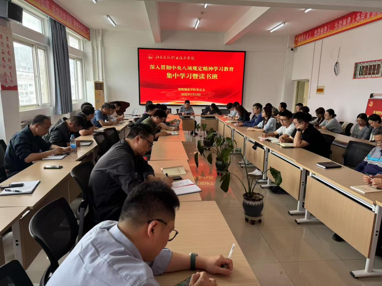 5月13日14:00,智能制造学院党总支在第一实训楼504会议室召开专题政治学习会议。会议集中学习了中央党的建设工作领导小组会议精神、《党的十八大以来深入贯彻中央八项规定精神的成效和经验》通知精神、习近平总书记在庆祝中华全国总工会成立100周年暨全国劳动模范和先进工作者表彰大会上的讲话精神,以及习近平总书记重要文章《激励新时代青年在中国式现代化建设中挺膺担当》(2025年5月1日《求是》杂志刊文)。此次学习由学院党总支书记王正扬领学,全体教职工参加学习。旨在深刻把握新时代党的建设总要求,巩固拓展作风建设成效,大力弘扬劳模精神、劳动精神、工匠精神,激励引导广大青年师生在中国式现代化建设中担当作为,切实把学习成效转化为推动学院高质量发展的强大动力。
